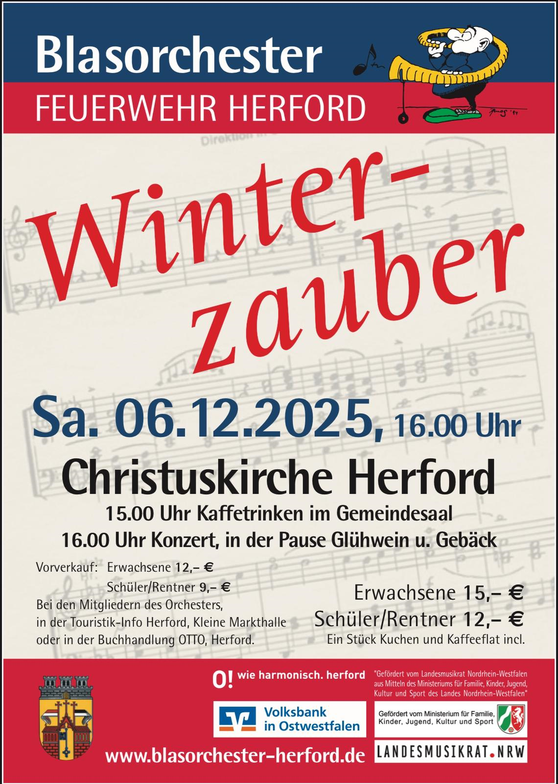 Am 06.12.2025 lädt das BFH zu einem winterlich- weihnachtlichen Programm in die Christuskirche Herford ein. Das mystische Phantom der Oper, die fulminanten Klänge des Herrn der Ringe, tanzende Nussknacker, aber auch rockige und besinnliche Weihnachtsmusik sollen das Publikum verzaubern und auf Weihnachten einstimmen. Erstmalig wird auch das Einsteigerorchester des BFH, AUFWIND, dabei sein und eigene Stücke präsentieren, aber auch gemeinsam mit dem großen Orchester sein Können unter Beweis stellen. Versüßt wird der Nachmittag mit einem Kuchenbuffet im Gemeindesaal vor dem Konzert und Getränken und Gebäck während der Pause in der Kirche.