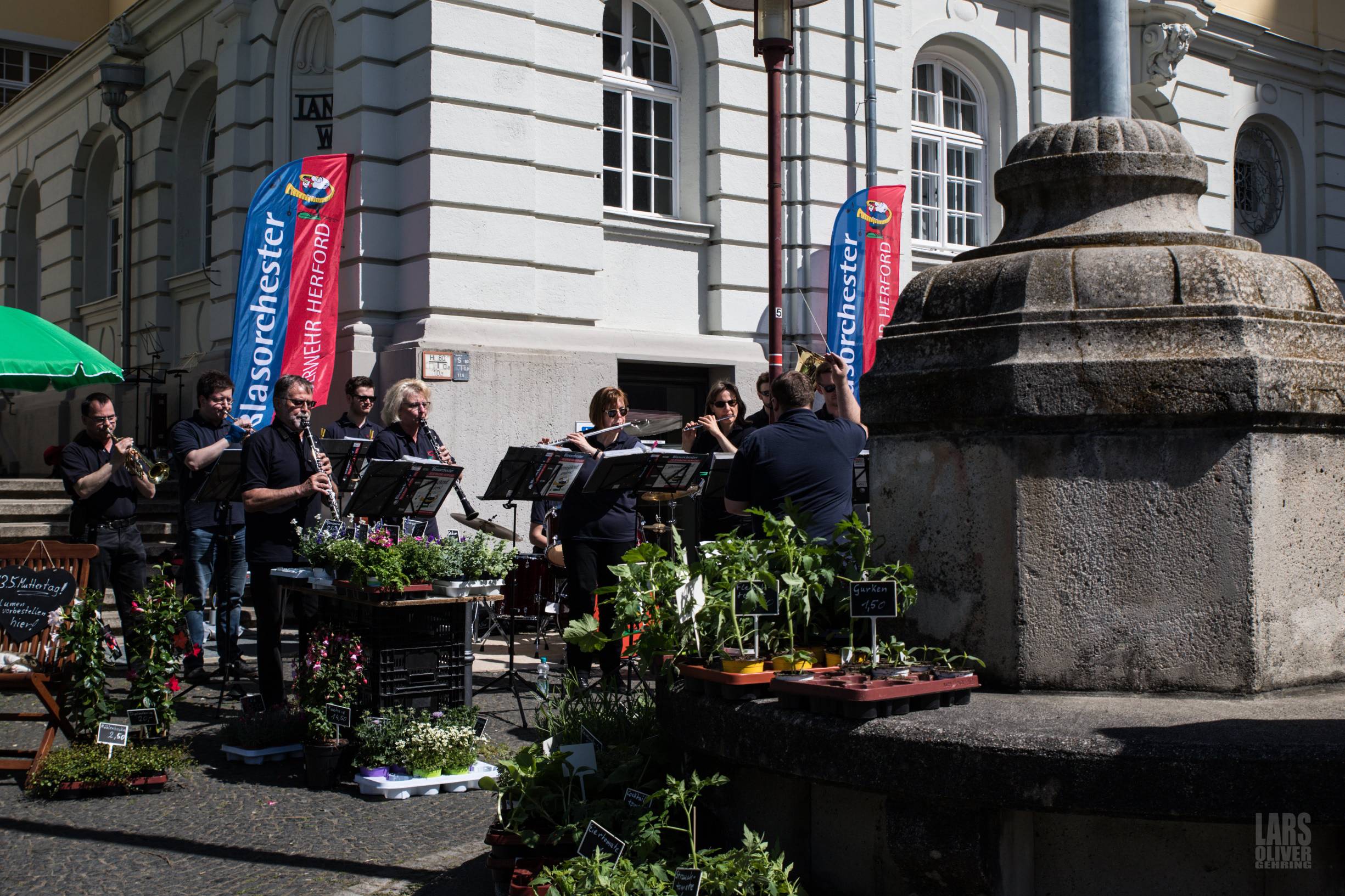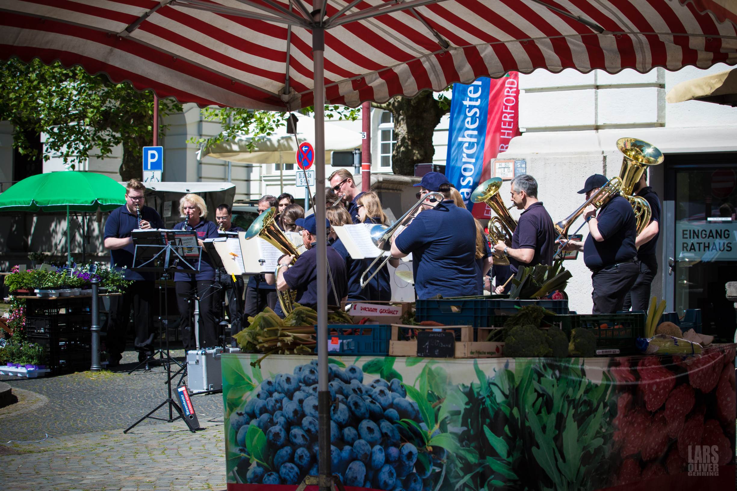 Am 05.05. fanden im Rahmen des Tags der Städtebauförderung in Herford auf allen Plätzen Aktivitäten statt. Das Blasorchester Feuerwehr Herford war von 11:30 – 14:00 Uhr auf dem Rathausplatz und hat dort die Marktbeschicker und -Besucher mit einem abwechslungsreichen Programm unterhalten. Besser konnte der Start in die Sommersaison nicht sein, denn das Wetter war herrlich und die Laune entsprechend gut. Da macht das Musizieren gleich doppelt Spaß. Danke an Lars-Oliver Gehring für die tollen Fotos und an Heike Buba, dass wir uns in den Pausen unter ihrem Schirm in den Schatten verkrümeln konnten. |